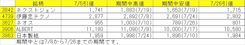 7月5日付のブログで掲載しました5銘柄の、その後の動きは以下の通りです。