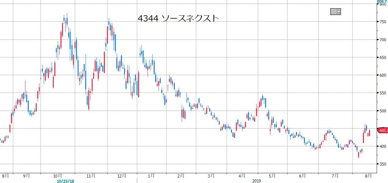 4344 ソースネクスト 東証一部 432円 PC用低価格ソフトが中心。ウイルス対策はシェア上位。自動翻訳機「ポケトーク」がヒット中。8月8日、20年3月期第1四半期営業利益が、0.9億円の黒字(前年同期比7.8%)の増益となったことを発表した。広告宣伝費は大幅に増加したものの、主力製品のAI通訳機「POCKETALK W」が国内外で販売が好調、売上高が前年同期比90.5%増と大幅に拡大、過去最高の四半期売上高を達成した。※日証金が新規売停止、現引停止銘柄に指定しています(8/13以降)。