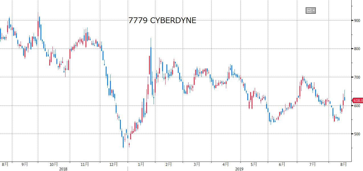 7779 CYBERDYNE 東証マザーズ 655円 ロボットスーツ「HAL」開発の筑波大発ベンチャー企業。レンタルによる医療・福祉サービスが主体。8月14日、20年3月期第1四半期(4-6月)の連結税引き前損益は2.7億円の黒字(前年同期は1.9億円の赤字)になったことを発表した。。またマレーシア政府と社会保障機構及び筑波大学と協力し、装着型サイボーグ「HAL」によるサイバニクス治療の普及に向けた各種協定を締結した。販路の拡大に期待できる。