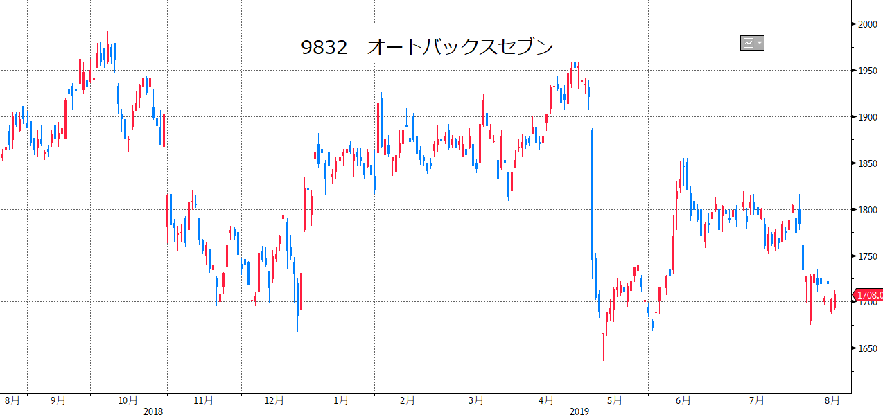 9832 オートバックスセブン 東証一部 1,724円 自動車用品小売り最大手。カー用品の販売や取り付けサービスなどを行う。「オートバックス」をFC中心に全国展開。欧州、アジアでも運営。20年3月期第1四半期の連結経常利益は前年同期比2.3倍の13.5億円に拡大したことを発表した。7月度日次売上概況は国内売上高が既存店ベースで前年比2.9%増。10月からの値上げ告知のタイヤ、ドライブレコーダーが好調に推移している。「あおり運転」による被害に遭遇しないための同レコーダー設置の必要性に、個人投資家の注目が集まった。今後も販売増が期待できるとみている。
