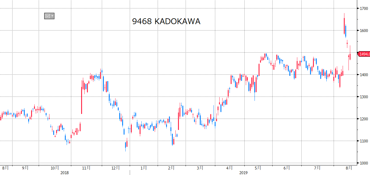 9468 KADOKAWA 東証一部 1,526円 書籍・雑誌の出版事業を中心に、ニコニコ動画などのWebサービスや、映像・ゲーム事業を展開。2015年にKADOKAWAとドワンゴが経営統合したことで誕生。ゲーム情報ポータブルなどシナジーを生む新事業を模索。8月8日、20年3月期第1四半期の連結営業利益は34.7億円(前年同期比8.7倍)だったことを発表。出版事業が、電子書籍・電子雑誌市場動向を注視した施策が功を奏し好調に推移。それに加え、映像・ゲーム事業が北米、中国などの海外ロイヤリティ収入が好調に推移し増益に。Webサービス事業がコスト削減効果などにより黒字転換したとなったことも寄与した。