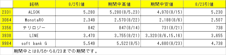 ■8月5日付ブログで掲載しました5銘柄の、その後の動き以下の通りです。