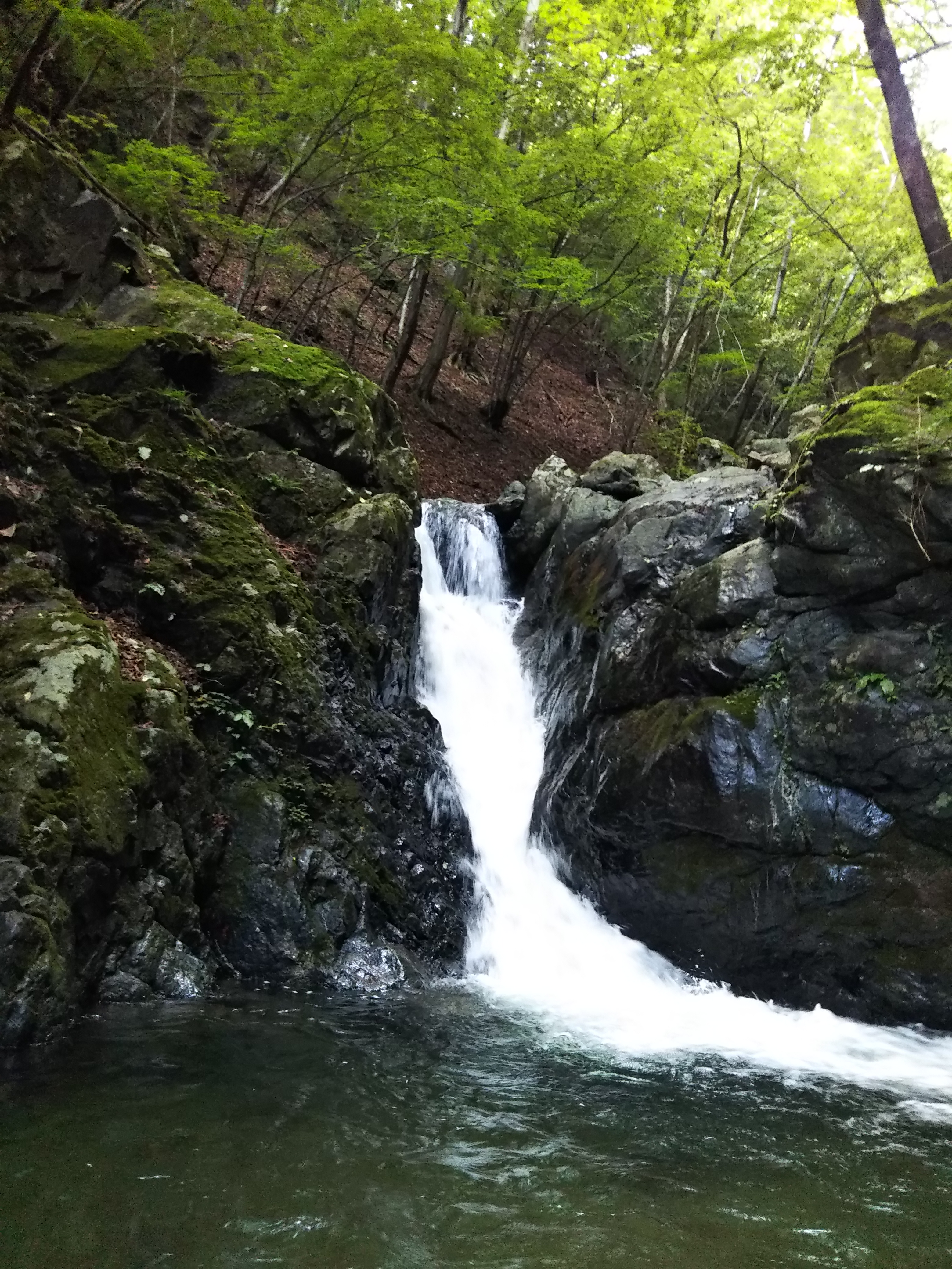 8月24日またまた水根沢に行って来ました。翌25日は奥多摩でワサビ田補修のイベント参加のため、水根沢キャンプ場にテン泊しました。水根沢は中間点の半円の滝で遡行終了とするパーティも多いですが、後半も面白いところがたくさんあります。最初の写真は後半右岸から入るシンナシ沢の滝、下の写真は6mスラブ滝で水量豊富で登れず高巻きました。