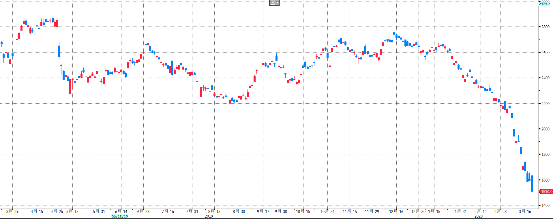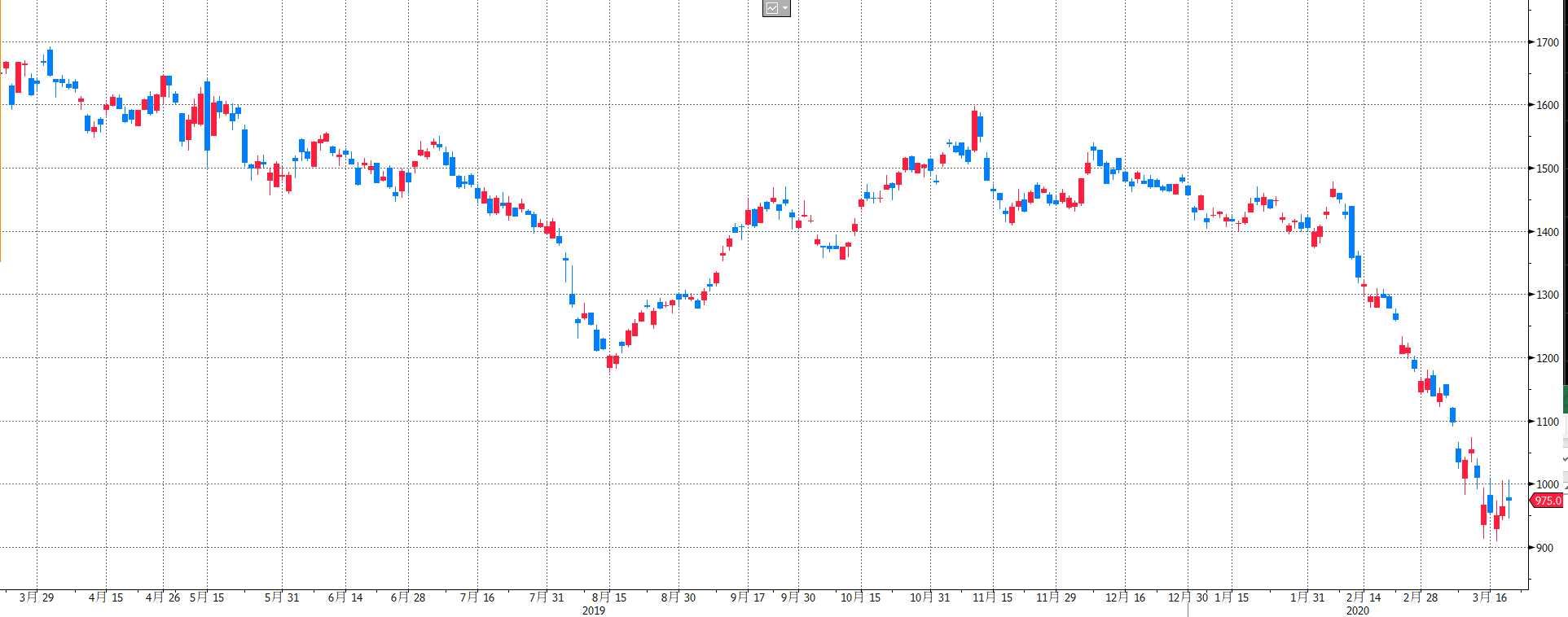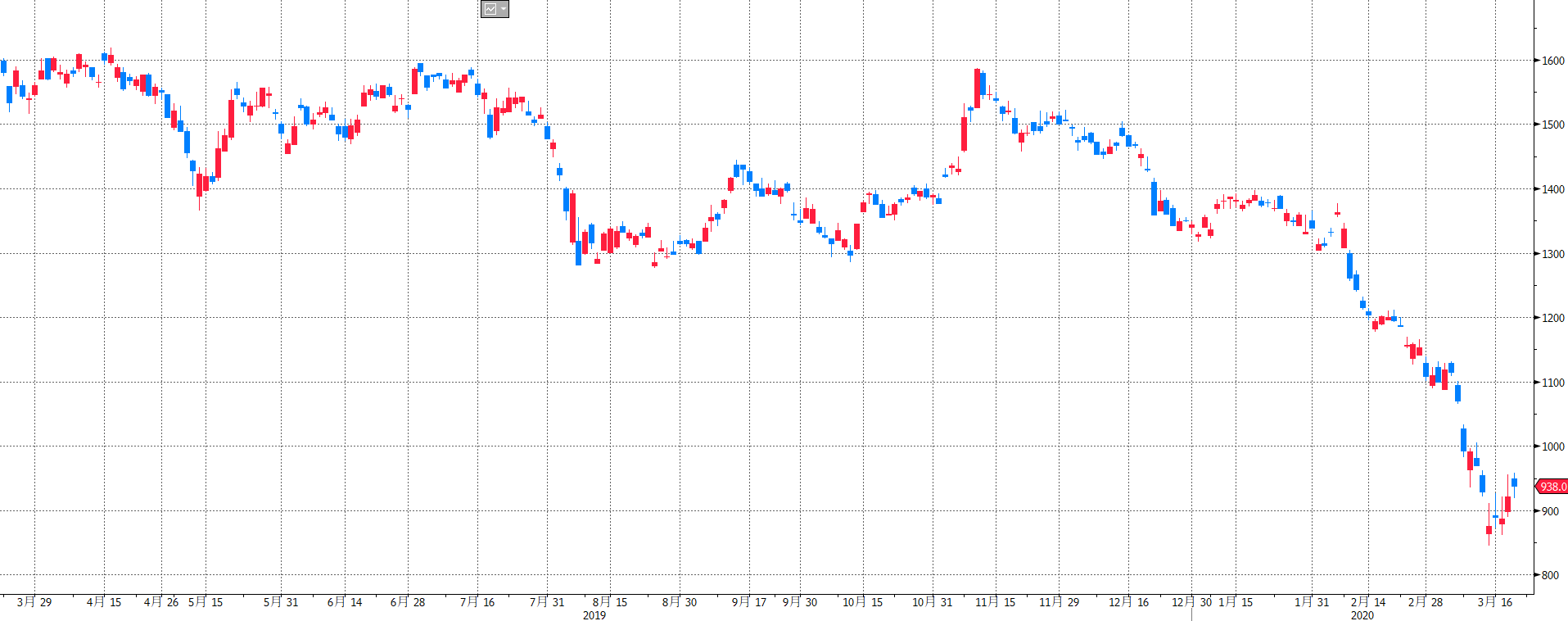 これらの材料から特に米国株式相場は、かつてない大きな値幅で振れています。日経平均も1月16日(同日終値23993.13円)に日本国内での初の感染者が出てから3月19日(同終値16552.83円)まで30.8%と大きく下落しています。しかし『朝の来ない夜はない』とも言います。今回は225銘柄の中から3月決算で、おおむね配当利回りが5%以上、PBRが1.0以下の銘柄を選んでみました。なお、株価、PER(当期予想)、PBR(前期実績)、3月19日引け値でjijipressから、チャートはブルームバーグから出典しています。なお、配当利回りは会社四季報2020年2集に掲載された2020年3月通期配当予想金額を基に計算しています。