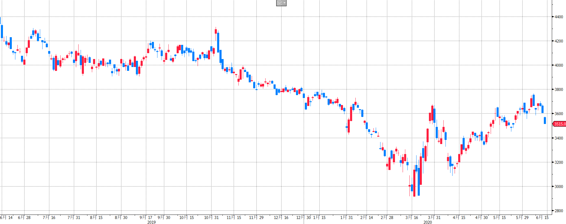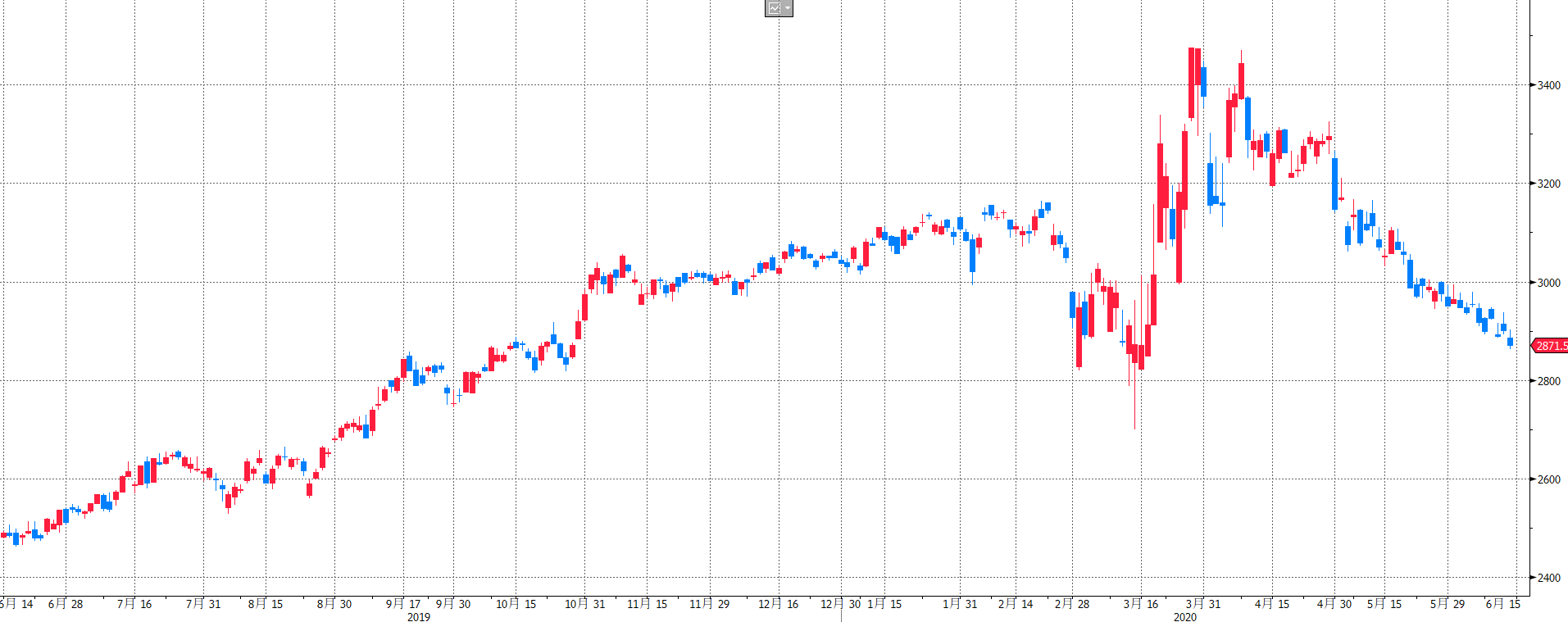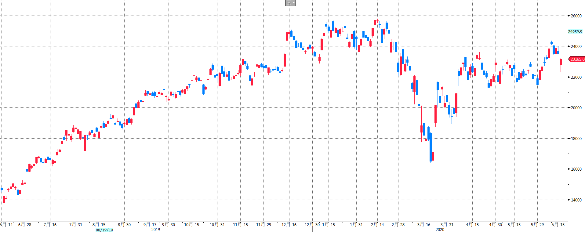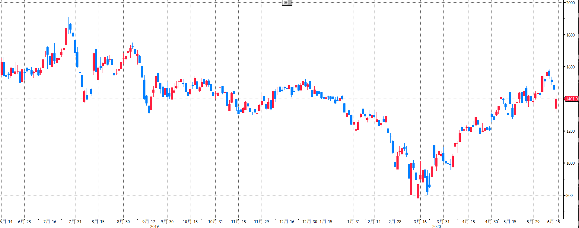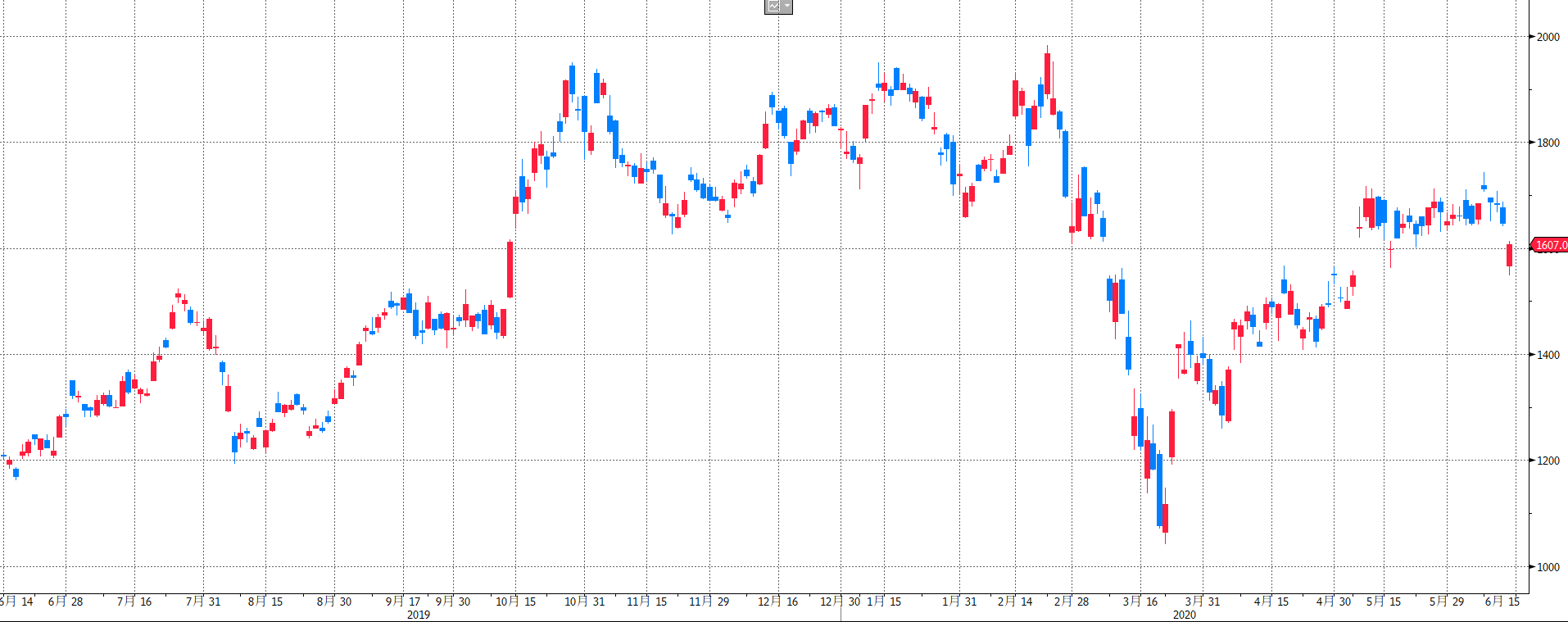 内閣府と財務省が11日発表した4∼6月期の法人企業景気予測調査では、大企業全産業の景況判断指数(BSI)は新型コロナウイルスの感染拡大に伴い、製造業・非製造業とも景況感が大幅に悪化した影響もありマイナス47.6となりました。マイナスは3四半期連続で、過去2番目の低さとなりました。それとは裏腹に日経平均は2/20高値(23806円)から3/19安値(16358円)までの下落幅7448円を、6/9(高値23185円)までに6827円(91.6%)戻しています。米NASDAQに至っては6/10に過去最高値となる10000ポイントを突破しました。株式市場は先行きの景気回復期待を頼りに意外高を演じてきましたが、さすがに足元は株価上昇に一服感が出ているようです。11日のNYダウは新型コロナウイルスの感染「第2波」が現実味を帯びたことから、前日比1861ドル安と大きく売り込まれました。前回のレポートでもお伝えしましたが、自分の考えではテーマ性が強かったり、業績に期待が持てる銘柄に絞り込むことが重要で、Wインバースなど相場下落で利益が出る弱気型のETFの活用を図るなど、より慎重に取り組んでいくことが必要と考えています。今回は以下の5銘柄を ご案内いたします。なお、株価、PER(当期予想)、PBR(前期実績)は6月12日引け値でjijipressから、チャートはブルームバーグから出典しています。