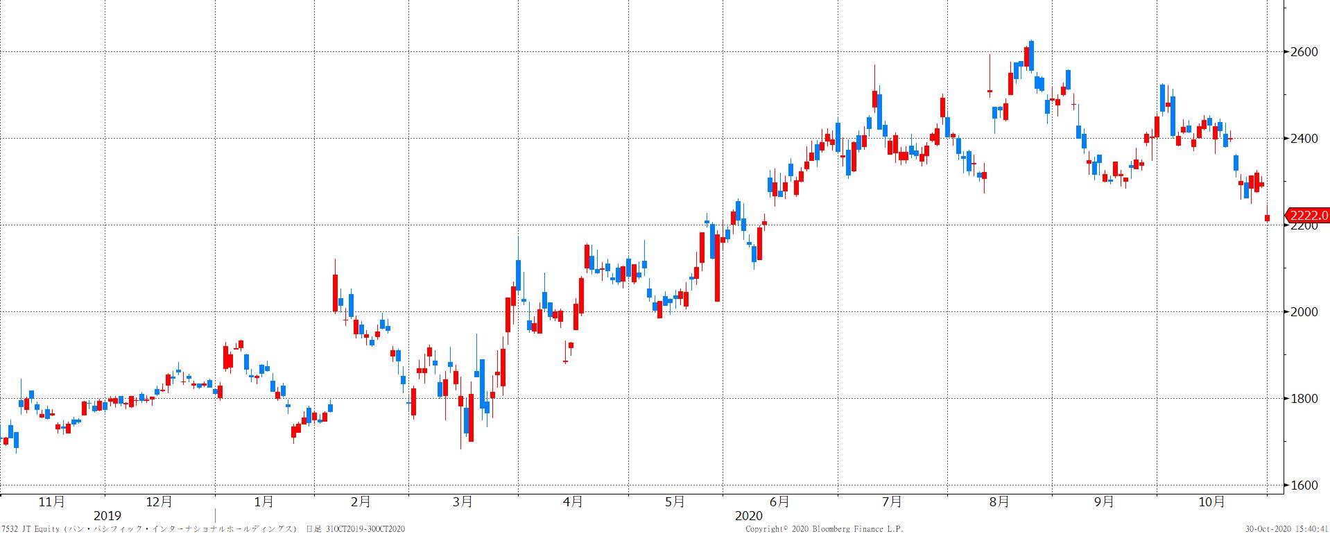 総合ディスカウント店ドン・キホーテを展開。長崎屋、ユニーが子会社です。コロナの影響で訪日観光客激減が前半直撃しましたが、海外は順調でした。ユニーとの共同仕入れで粗利益率が徐々に改善しています。2020年6月期の海外売上高は約1,150億円で、30年には1兆円に高める計画です。海外では売上高の8割以上を食品が占め、現在200億円規模の生鮮品輸出は30年には3,000億円に増やす計画です。そのため当社は10月23日、日本の農畜水産品を輸出する会員組織を立ち上げました。当社の安田会長は「日本の1次産品は良質。無尽蔵の海外市場が口を開けて待っている」と話しています。このほど香港島の金融街に「ドンドンドンキ」4号店を出店、大規模デモやコロナウイルス感染拡大で中国本土からの観光客は激減しましたが、各店舗は地元客で連日にぎわっています。