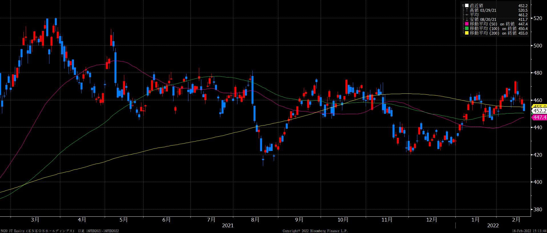 17年4月に東燃ゼネラルと経営統合、国内シェア5割の石油元売り首位の企業です。銅など非鉄事業も兼営しています。同社は2月10日、2022年3月期第3四半期の業績発表を行いました。それによりますと、第3四半期実績(4-12月)は営業利益・当期利益は資源価格の上昇による在庫影響などにより大幅な増益となり、在庫影響を除いた営業利益は2,773億円(前年同期比1,124億円増)となりました。エネルギーセグメントの第3四半期連結累計期間の売上高は6兆1,689億円(前年同期比46.9%増)、営業利益は3,007億円(前年同期は893億円)石油・天然ガス開発セグメントは売上高は1,614億円(同110.4%増)、営業利益は716億円(前年同期は66億円)、金属セグメントは売上高9,835億円(同28.5%増)、営業利益は1,227億円(前年同期は54億円の損失)となりました。