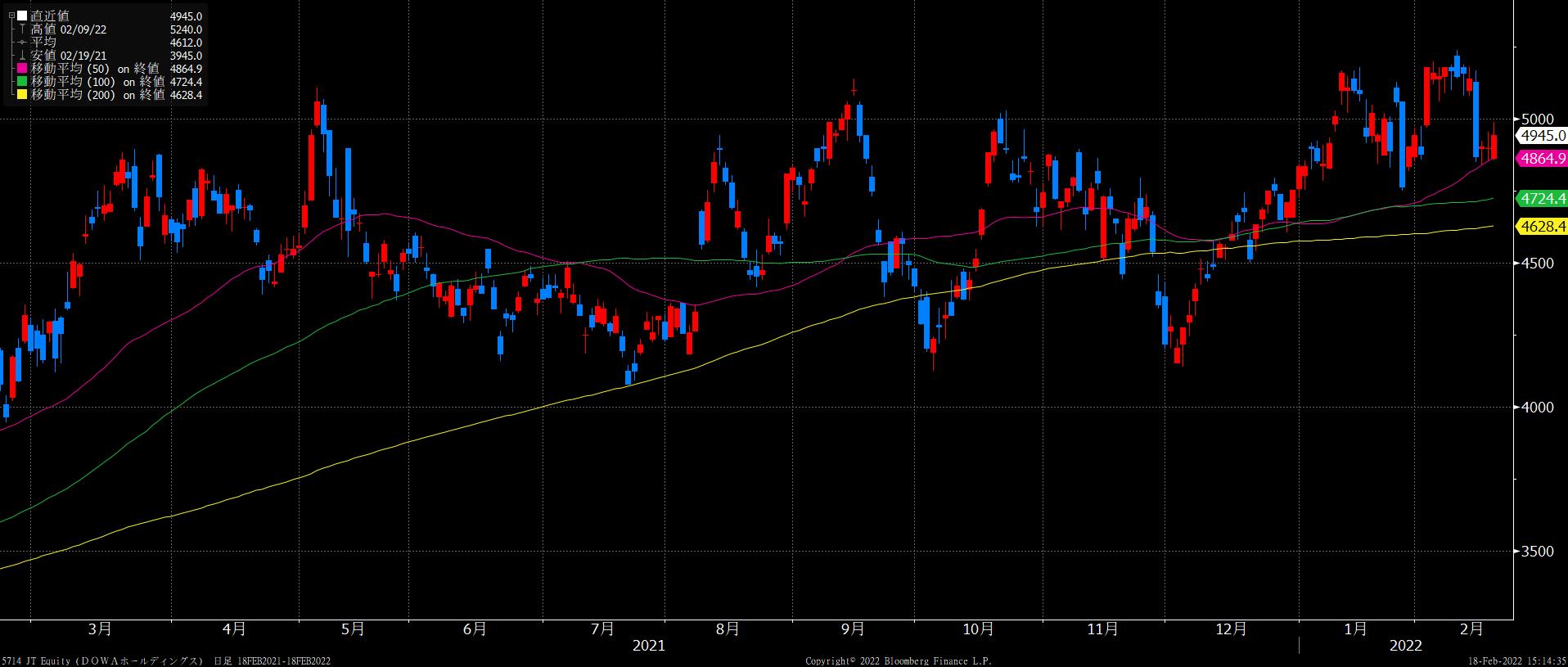 米労働省が10日に発表した1月の消費者物価指数(CPI)は前年同月比7.5%上昇と約40年ぶりの高水準を記録しました。15日発表の米卸売物価指数(PPI)も前月比1%上昇と市場予想の2倍の伸びとなりました。インフレ加速を受けて大手金融機関は今月に入って米連邦準備理事会(FRB)による利上げ回数の予測を引き上げ、引き締めへの警戒感が広がっています。米ゴールドマン・サックスは年内のFRBの利上げ回数を7回と従来の5回から上方修正しました。市場では金利上昇が個人消費を下振れさせ、景気悪化を招きかねない「オーバーキル」の懸念が高まっています。一方、中長期では景気の緩やかな拡大と企業の利益成長が続くとの見方は依然多いようです。「金融引き締めで景気が大きく冷え込む可能性はまだ低く、企業業績の見通しも変わっていない」との声もあります。