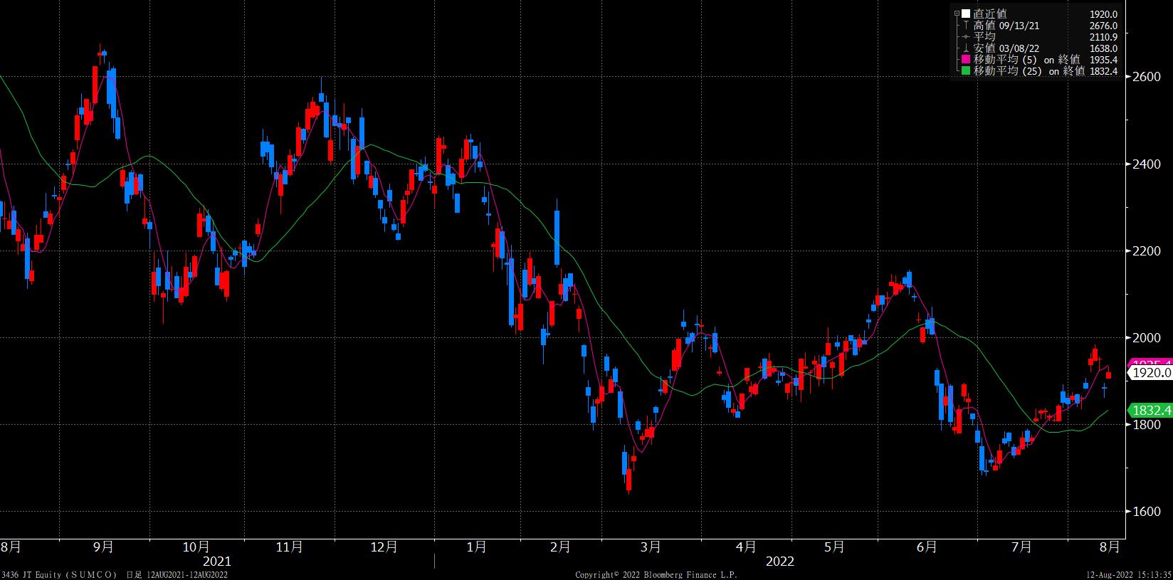 旧住友金属と三菱マテリアルのシリコンウエハーを統合し、コマツ系も合流した半導体用シリコンウエハー世界首位級の企業です。同社は8月4日2022年12月期第2四半期の業績発表を行いました。それによりますと世界シェア3割の半導体用シリコンウエハーで先端品向けの直径300mmの出荷は好調で供給能力を上回る強い需給が継続、価格も契約価格通りでスポット価格は上昇しています。業界全体の300mmウエハーの生産能力は足元で月産800万枚付近とほぼフル生産状態となっており、ウエハー各社の増産余地が限られる中、今後も需給ひっ迫が続くとみられています。